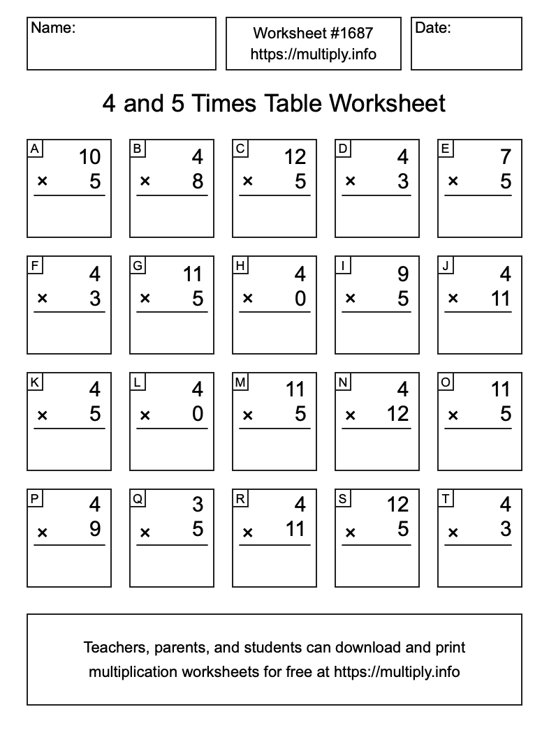 Here is the 4 and 5 Times Table Worksheet #1687. This worksheet contains problems related to the multiplication table of 4 and the multiplication table of 5. Print and/or save the worksheet using the buttons below the image. You can also drag or right-click on the image to download it to your device.