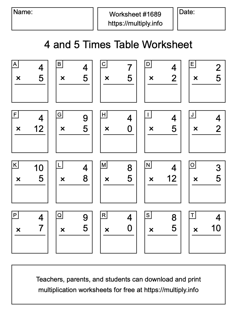 Here is the 4 and 5 Times Table Worksheet #1689. This worksheet contains problems related to the multiplication table of 4 and the multiplication table of 5. Print and/or save the worksheet using the buttons below the image. You can also drag or right-click on the image to download it to your device.