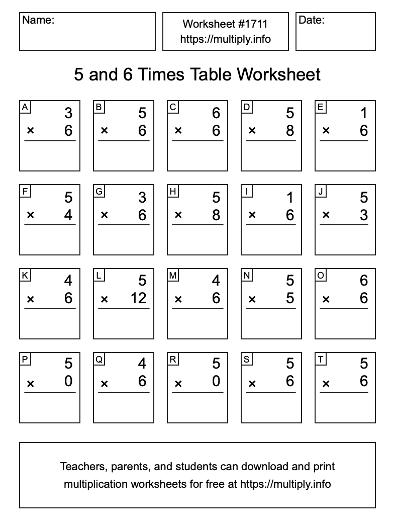 Here is the 5 and 6 Times Table Worksheet #1711. This worksheet contains problems related to the multiplication table of 5 and the multiplication table of 6. Print and/or save the worksheet using the buttons below the image. You can also drag or right-click on the image to download it to your device.