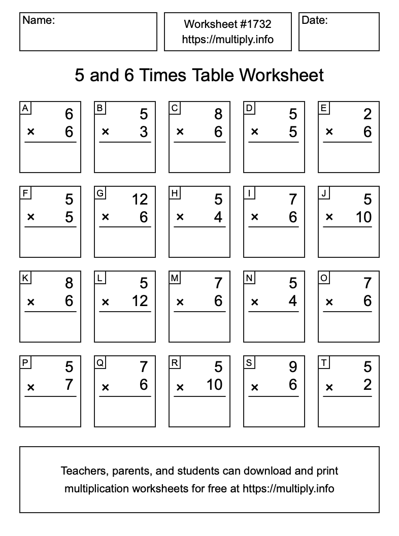 Here is the 5 and 6 Times Table Worksheet #1732. This worksheet contains problems related to the multiplication table of 5 and the multiplication table of 6. Print and/or save the worksheet using the buttons below the image. You can also drag or right-click on the image to download it to your device.
