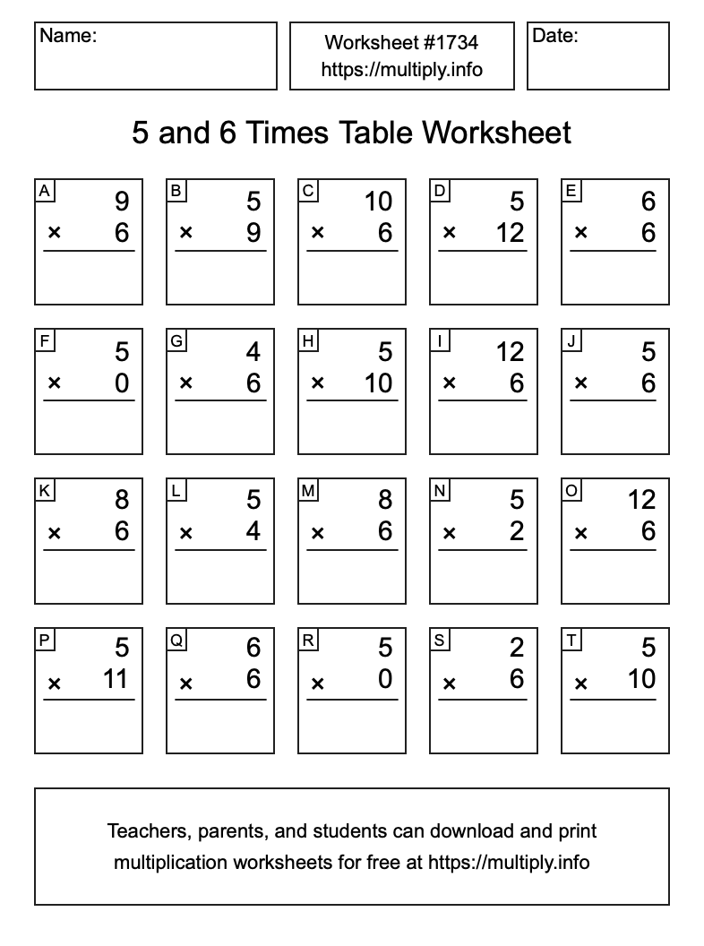 Here is the 5 and 6 Times Table Worksheet #1734. This worksheet contains problems related to the multiplication table of 5 and the multiplication table of 6. Print and/or save the worksheet using the buttons below the image. You can also drag or right-click on the image to download it to your device.