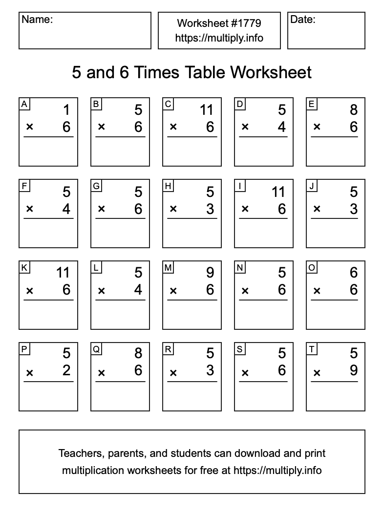 Here is the 5 and 6 Times Table Worksheet #1779. This worksheet contains problems related to the multiplication table of 5 and the multiplication table of 6. Print and/or save the worksheet using the buttons below the image. You can also drag or right-click on the image to download it to your device.