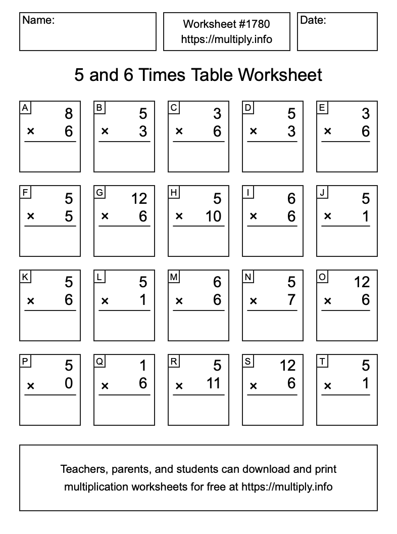 Here is the 5 and 6 Times Table Worksheet #1780. This worksheet contains problems related to the multiplication table of 5 and the multiplication table of 6. Print and/or save the worksheet using the buttons below the image. You can also drag or right-click on the image to download it to your device.
