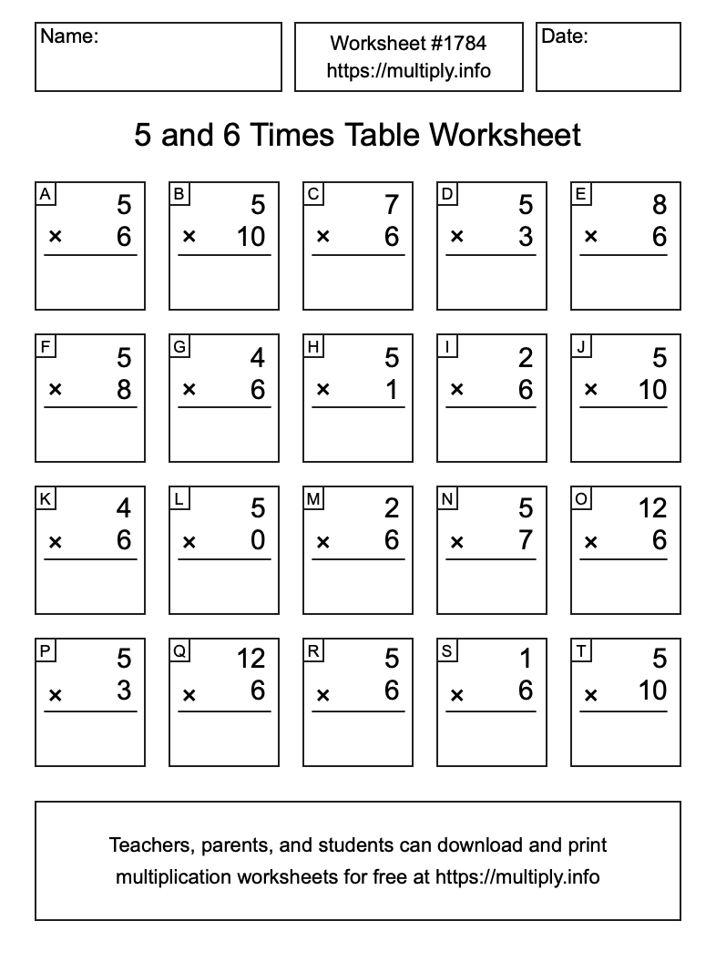 Here is the 5 and 6 Times Table Worksheet #1784. This worksheet contains problems related to the multiplication table of 5 and the multiplication table of 6. Print and/or save the worksheet using the buttons below the image. You can also drag or right-click on the image to download it to your device.