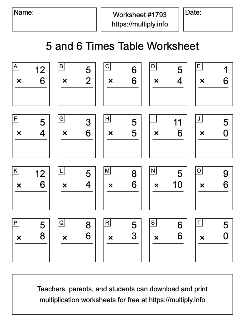 Here is the 5 and 6 Times Table Worksheet #1793. This worksheet contains problems related to the multiplication table of 5 and the multiplication table of 6. Print and/or save the worksheet using the buttons below the image. You can also drag or right-click on the image to download it to your device.