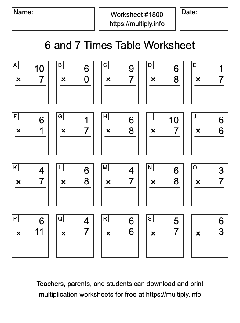Here is the 6 and 7 Times Table Worksheet #1800. This worksheet contains problems related to the multiplication table of 6 and the multiplication table of 7. Print and/or save the worksheet using the buttons below the image. You can also drag or right-click on the image to download it to your device.