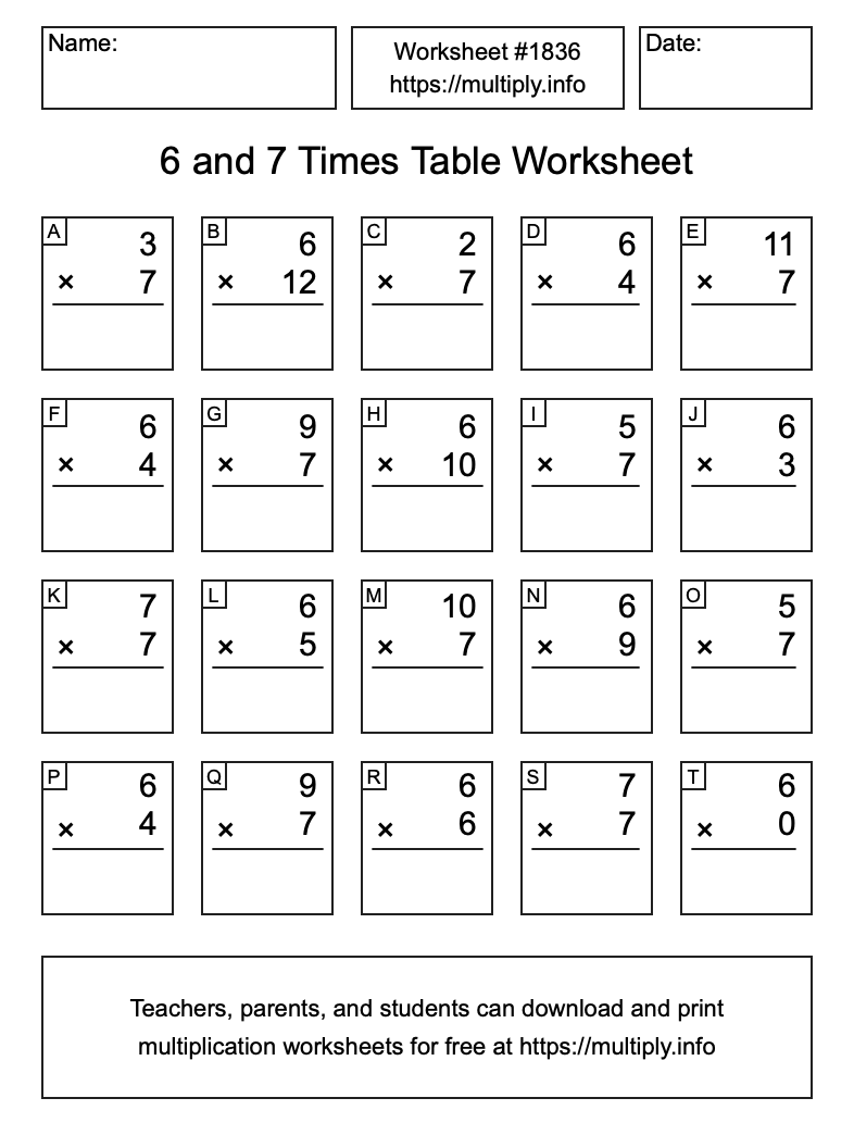 Here is the 6 and 7 Times Table Worksheet #1836. This worksheet contains problems related to the multiplication table of 6 and the multiplication table of 7. Print and/or save the worksheet using the buttons below the image. You can also drag or right-click on the image to download it to your device.