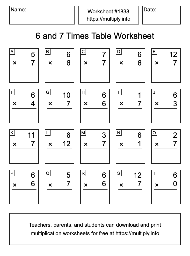 Here is the 6 and 7 Times Table Worksheet #1838. This worksheet contains problems related to the multiplication table of 6 and the multiplication table of 7. Print and/or save the worksheet using the buttons below the image. You can also drag or right-click on the image to download it to your device.