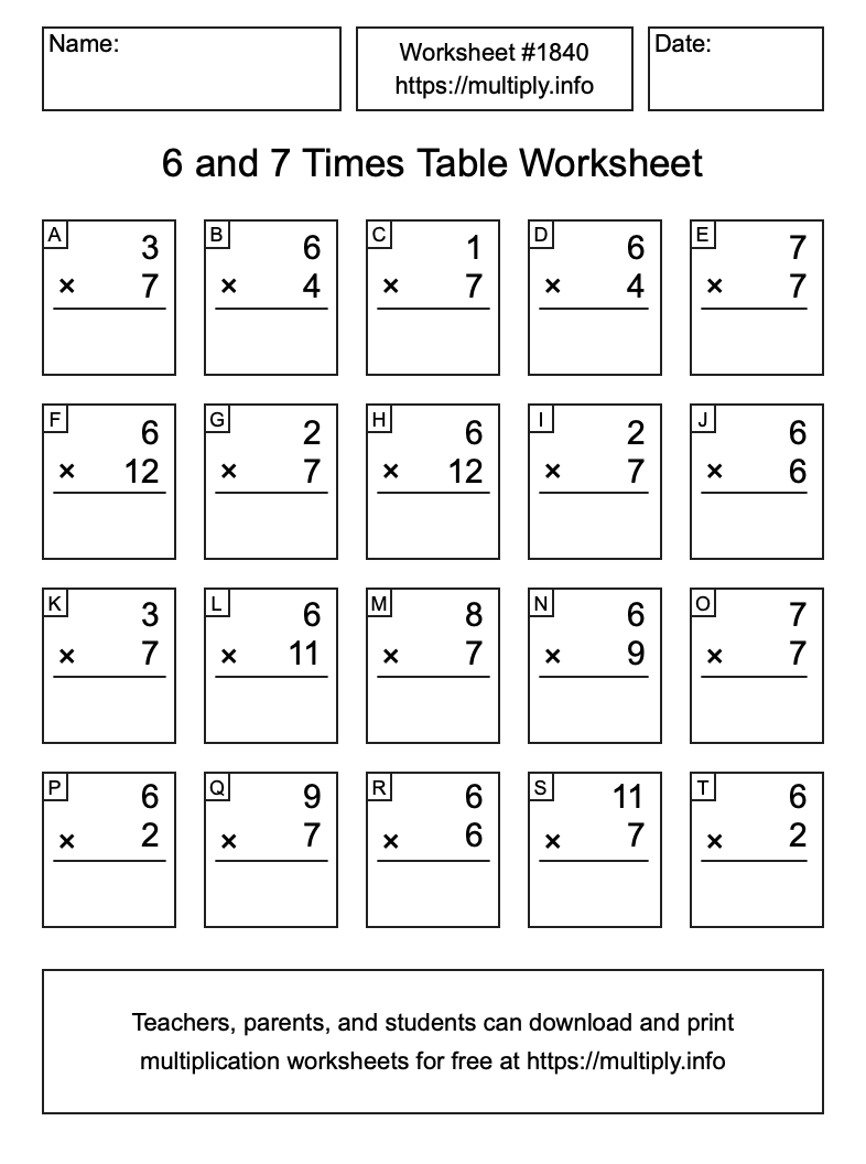 Here is the 6 and 7 Times Table Worksheet #1840. This worksheet contains problems related to the multiplication table of 6 and the multiplication table of 7. Print and/or save the worksheet using the buttons below the image. You can also drag or right-click on the image to download it to your device.