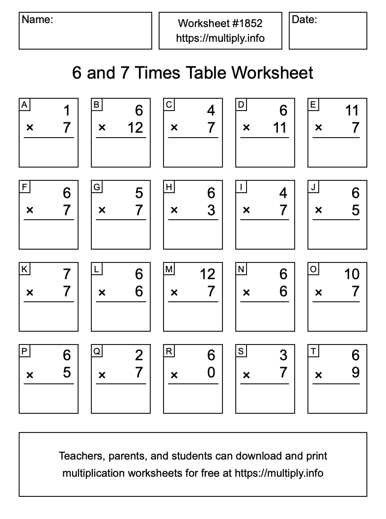 Here is the 6 and 7 Times Table Worksheet #1852. This worksheet contains problems related to the multiplication table of 6 and the multiplication table of 7. Print and/or save the worksheet using the buttons below the image. You can also drag or right-click on the image to download it to your device.