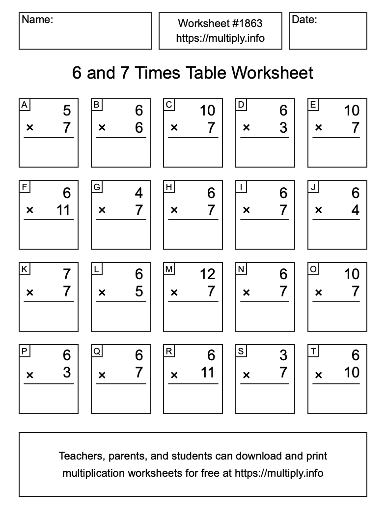 Here is the 6 and 7 Times Table Worksheet #1863. This worksheet contains problems related to the multiplication table of 6 and the multiplication table of 7. Print and/or save the worksheet using the buttons below the image. You can also drag or right-click on the image to download it to your device.