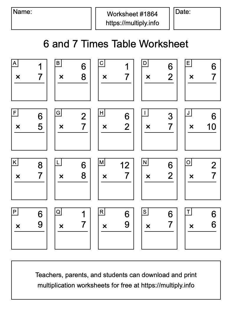 Here is the 6 and 7 Times Table Worksheet #1864. This worksheet contains problems related to the multiplication table of 6 and the multiplication table of 7. Print and/or save the worksheet using the buttons below the image. You can also drag or right-click on the image to download it to your device.