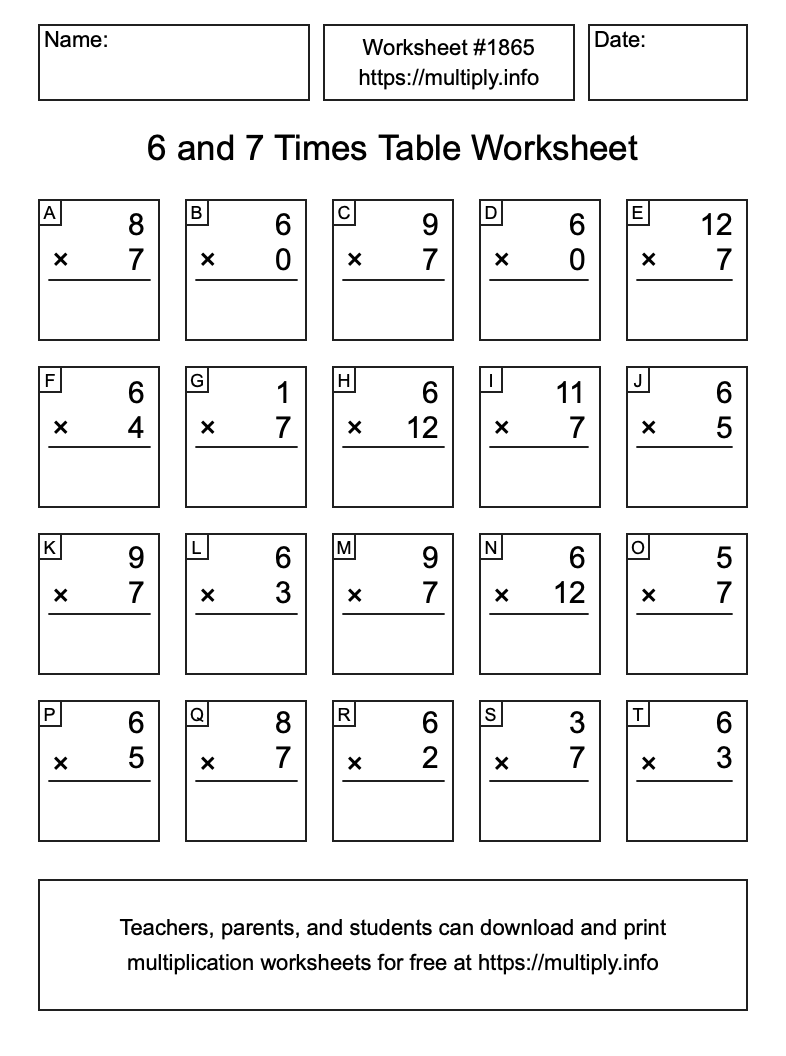 Here is the 6 and 7 Times Table Worksheet #1865. This worksheet contains problems related to the multiplication table of 6 and the multiplication table of 7. Print and/or save the worksheet using the buttons below the image. You can also drag or right-click on the image to download it to your device.