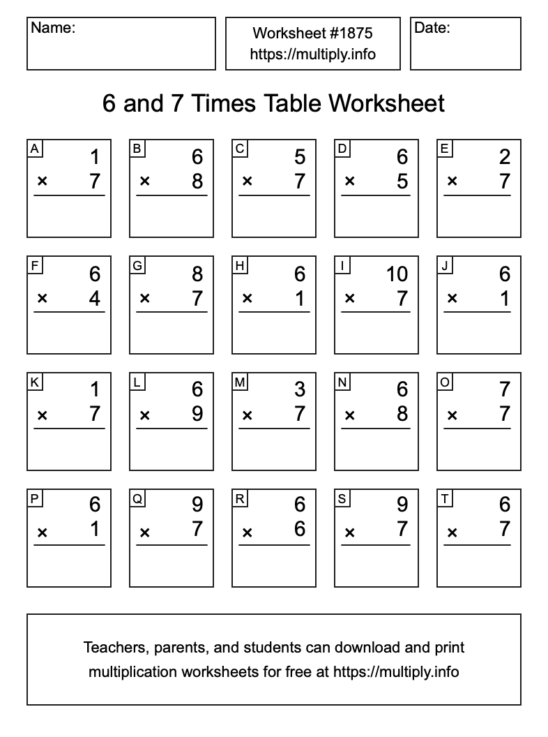 Here is the 6 and 7 Times Table Worksheet #1875. This worksheet contains problems related to the multiplication table of 6 and the multiplication table of 7. Print and/or save the worksheet using the buttons below the image. You can also drag or right-click on the image to download it to your device.