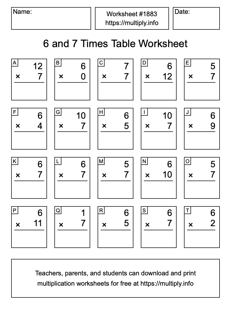 Here is the 6 and 7 Times Table Worksheet #1883. This worksheet contains problems related to the multiplication table of 6 and the multiplication table of 7. Print and/or save the worksheet using the buttons below the image. You can also drag or right-click on the image to download it to your device.