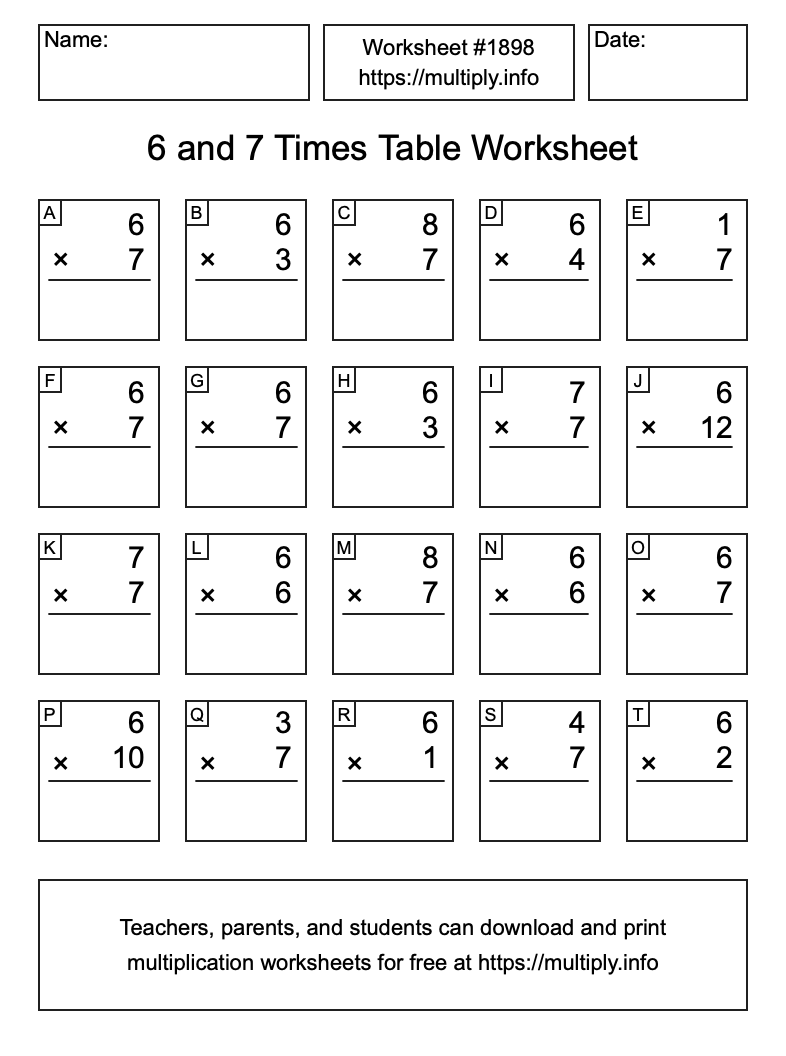 Here is the 6 and 7 Times Table Worksheet #1898. This worksheet contains problems related to the multiplication table of 6 and the multiplication table of 7. Print and/or save the worksheet using the buttons below the image. You can also drag or right-click on the image to download it to your device.
