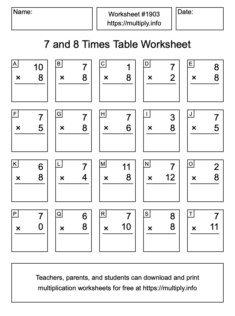 7 and 8 Times Table Worksheet #1904