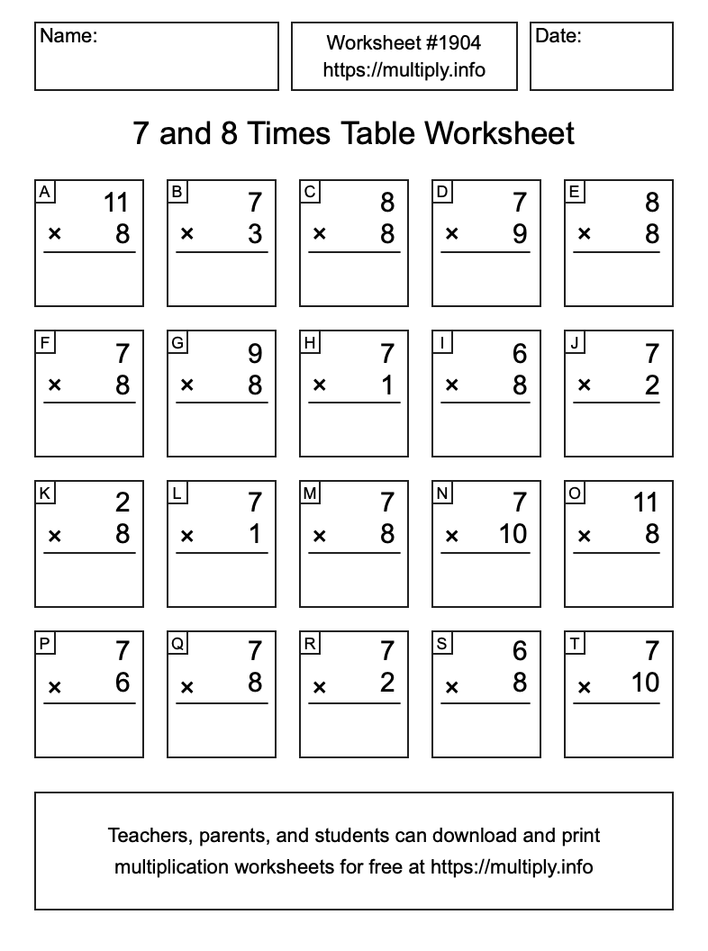7 and 8 Times Table Worksheet #1905