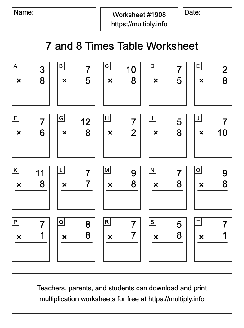 7 and 8 Times Table Worksheet #1909