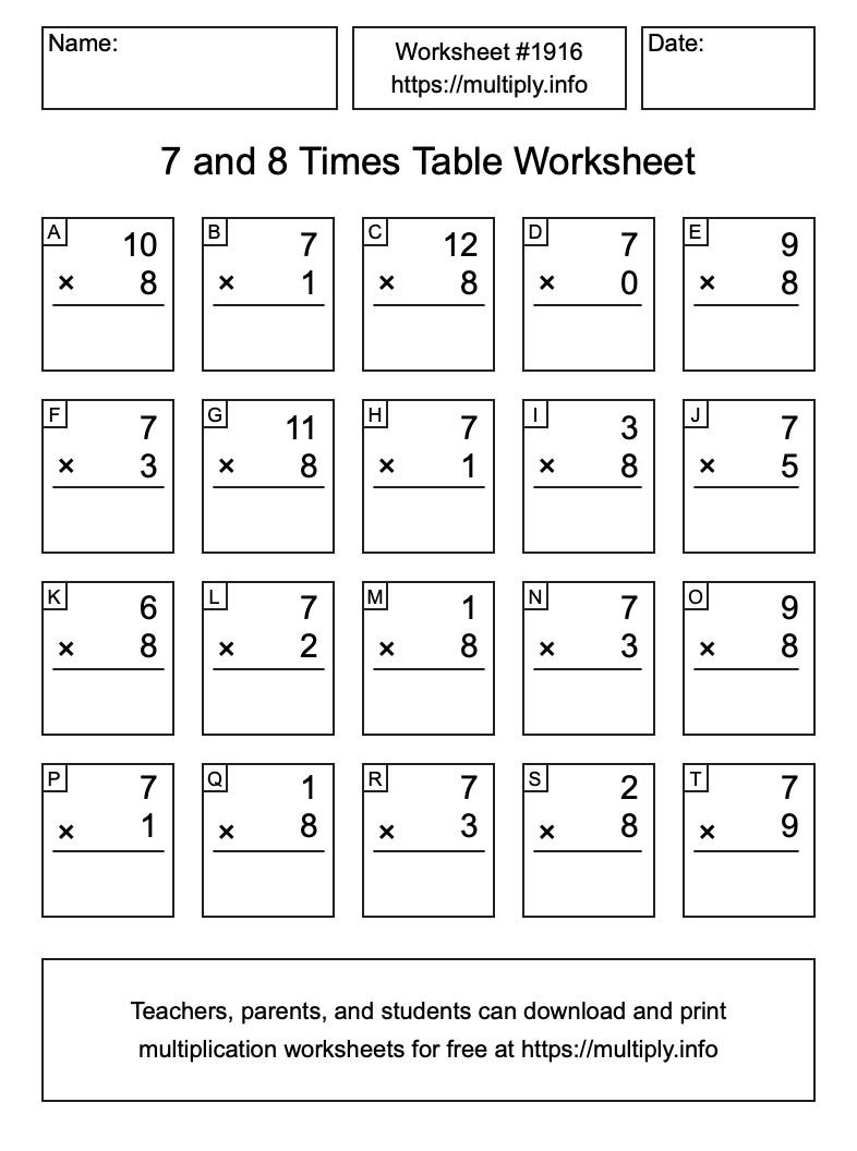 Here is the 7 and 8 Times Table Worksheet #1916. This worksheet contains problems related to the multiplication table of 7 and the multiplication table of 8. Print and/or save the worksheet using the buttons below the image. You can also drag or right-click on the image to download it to your device.