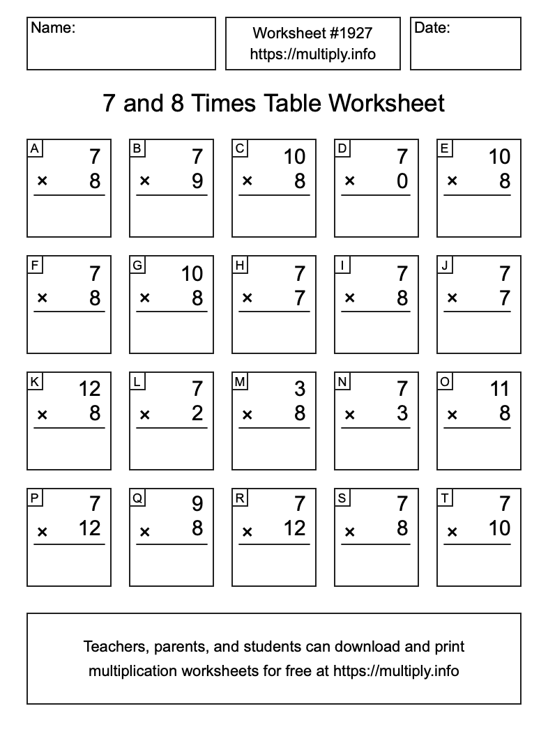 Here is the 7 and 8 Times Table Worksheet #1927. This worksheet contains problems related to the multiplication table of 7 and the multiplication table of 8. Print and/or save the worksheet using the buttons below the image. You can also drag or right-click on the image to download it to your device.