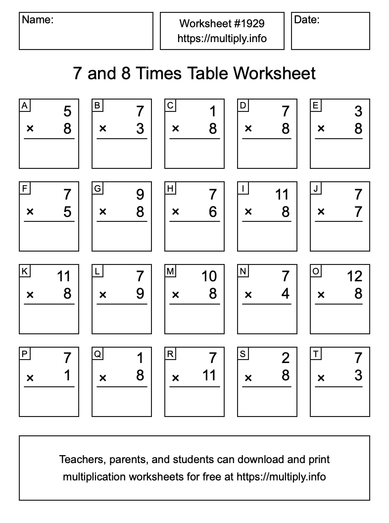 7 and 8 Times Table Worksheet #1930