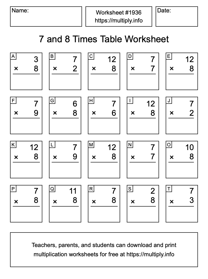7 and 8 Times Table Worksheet #1937