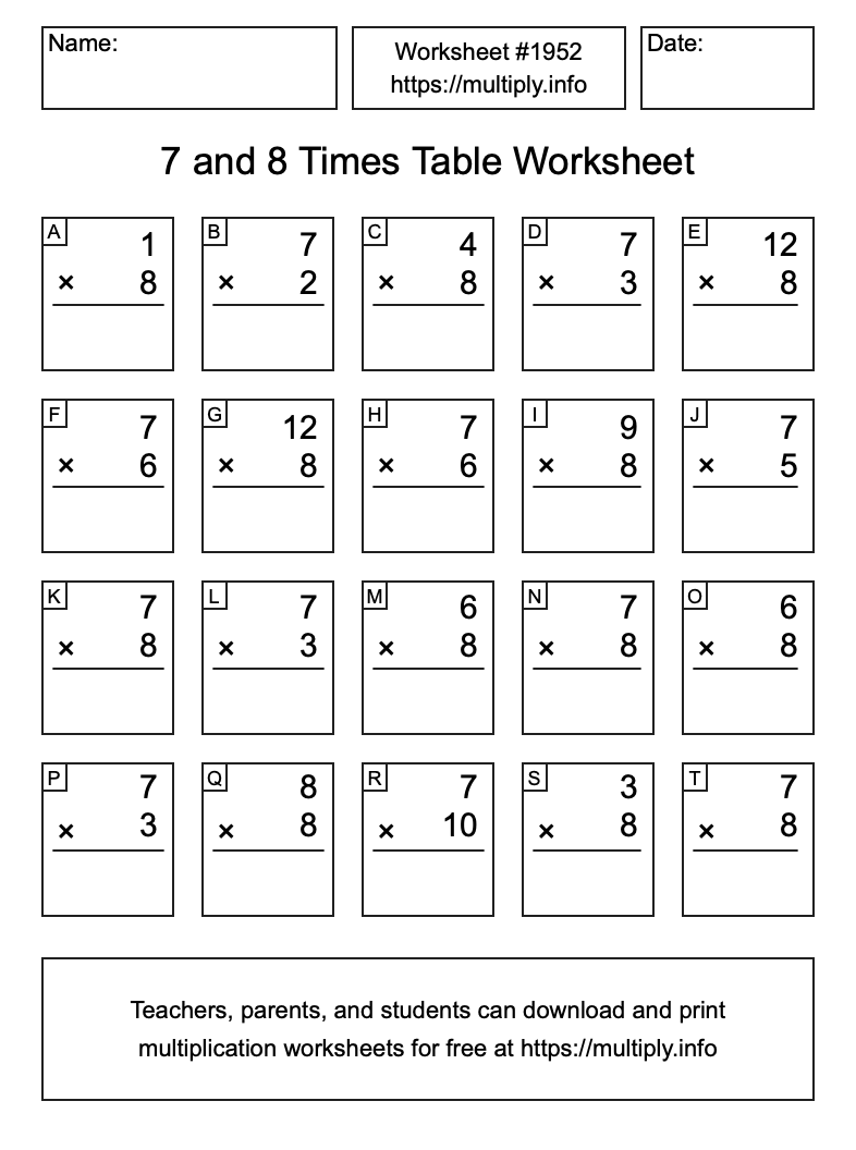 Here is the 7 and 8 Times Table Worksheet #1952. This worksheet contains problems related to the multiplication table of 7 and the multiplication table of 8. Print and/or save the worksheet using the buttons below the image. You can also drag or right-click on the image to download it to your device.