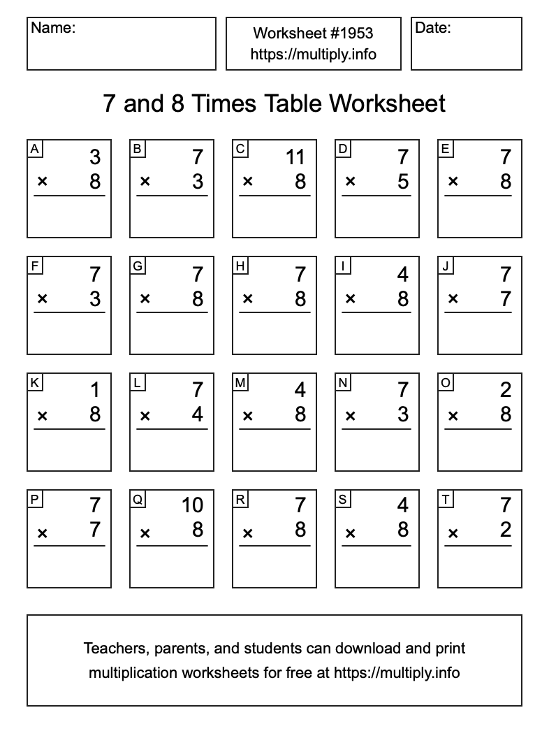 7 and 8 Times Table Worksheet #1954