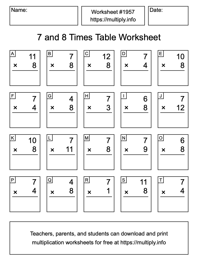 7 and 8 Times Table Worksheet #1958
