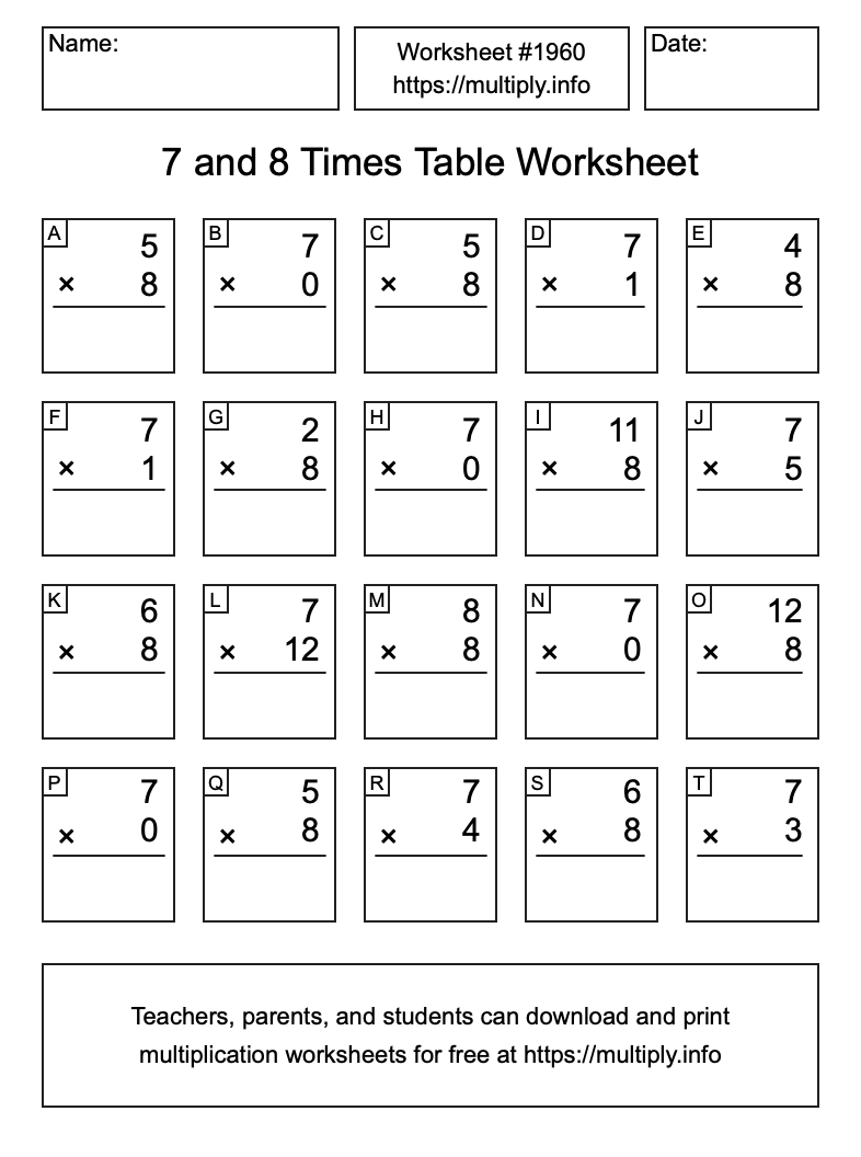 Here is the 7 and 8 Times Table Worksheet #1960. This worksheet contains problems related to the multiplication table of 7 and the multiplication table of 8. Print and/or save the worksheet using the buttons below the image. You can also drag or right-click on the image to download it to your device.