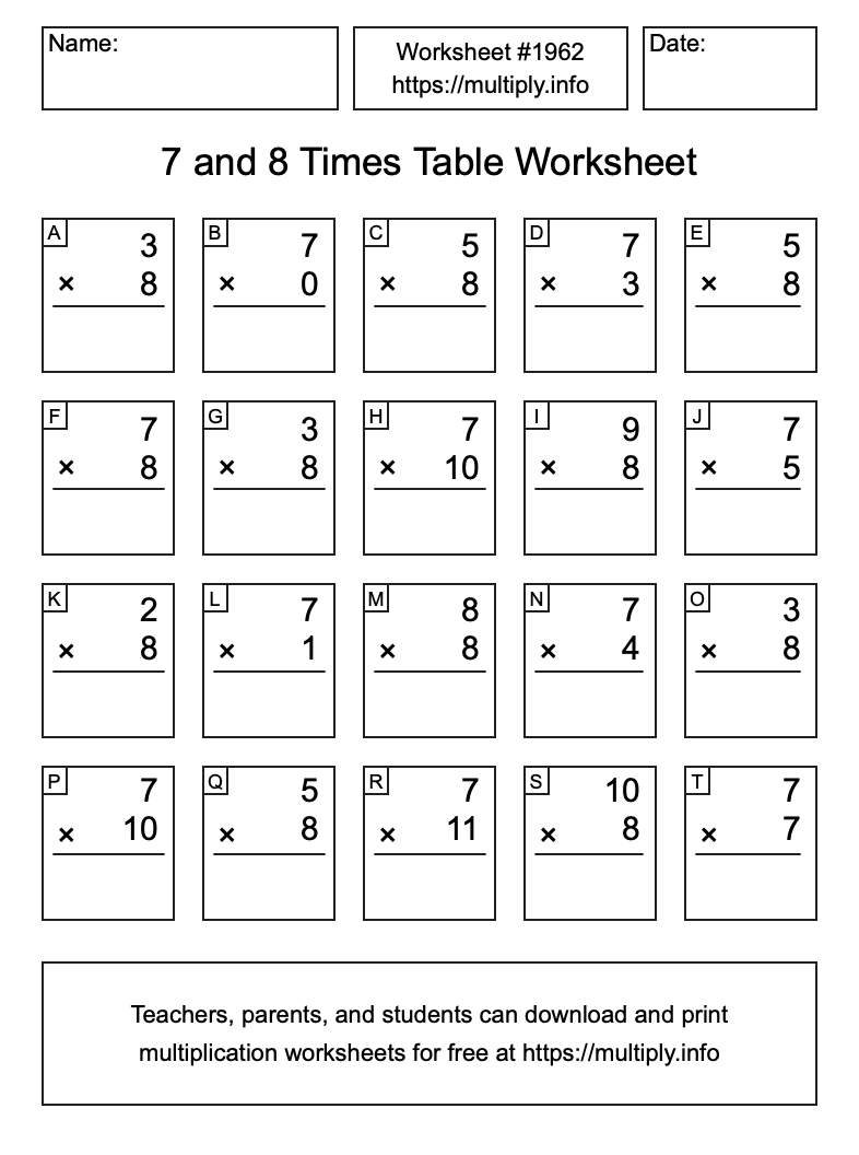 Here is the 7 and 8 Times Table Worksheet #1962. This worksheet contains problems related to the multiplication table of 7 and the multiplication table of 8. Print and/or save the worksheet using the buttons below the image. You can also drag or right-click on the image to download it to your device.