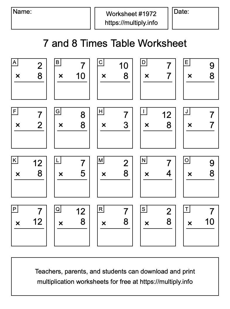 Here is the 7 and 8 Times Table Worksheet #1972. This worksheet contains problems related to the multiplication table of 7 and the multiplication table of 8. Print and/or save the worksheet using the buttons below the image. You can also drag or right-click on the image to download it to your device.