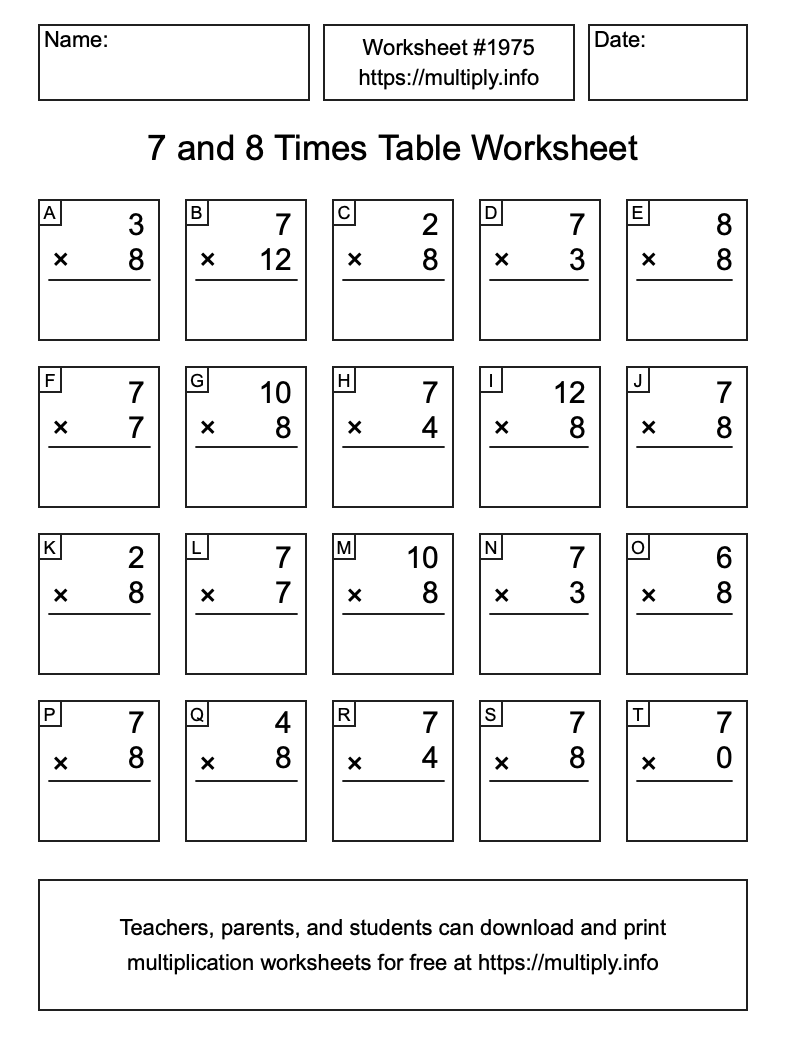 Here is the 7 and 8 Times Table Worksheet #1975. This worksheet contains problems related to the multiplication table of 7 and the multiplication table of 8. Print and/or save the worksheet using the buttons below the image. You can also drag or right-click on the image to download it to your device.