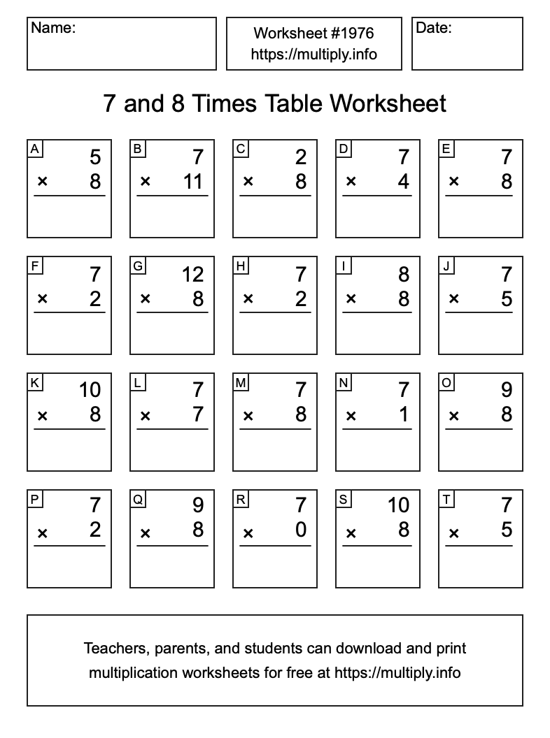 Here is the 7 and 8 Times Table Worksheet #1976. This worksheet contains problems related to the multiplication table of 7 and the multiplication table of 8. Print and/or save the worksheet using the buttons below the image. You can also drag or right-click on the image to download it to your device.