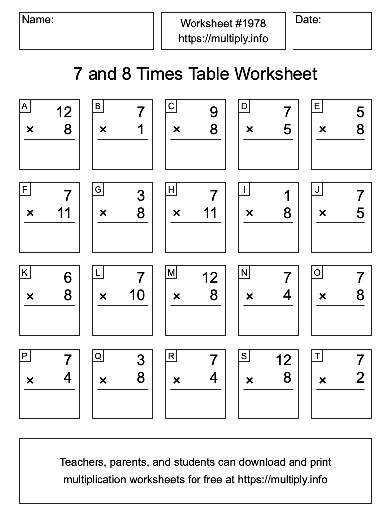 7 and 8 Times Table Worksheet #1979