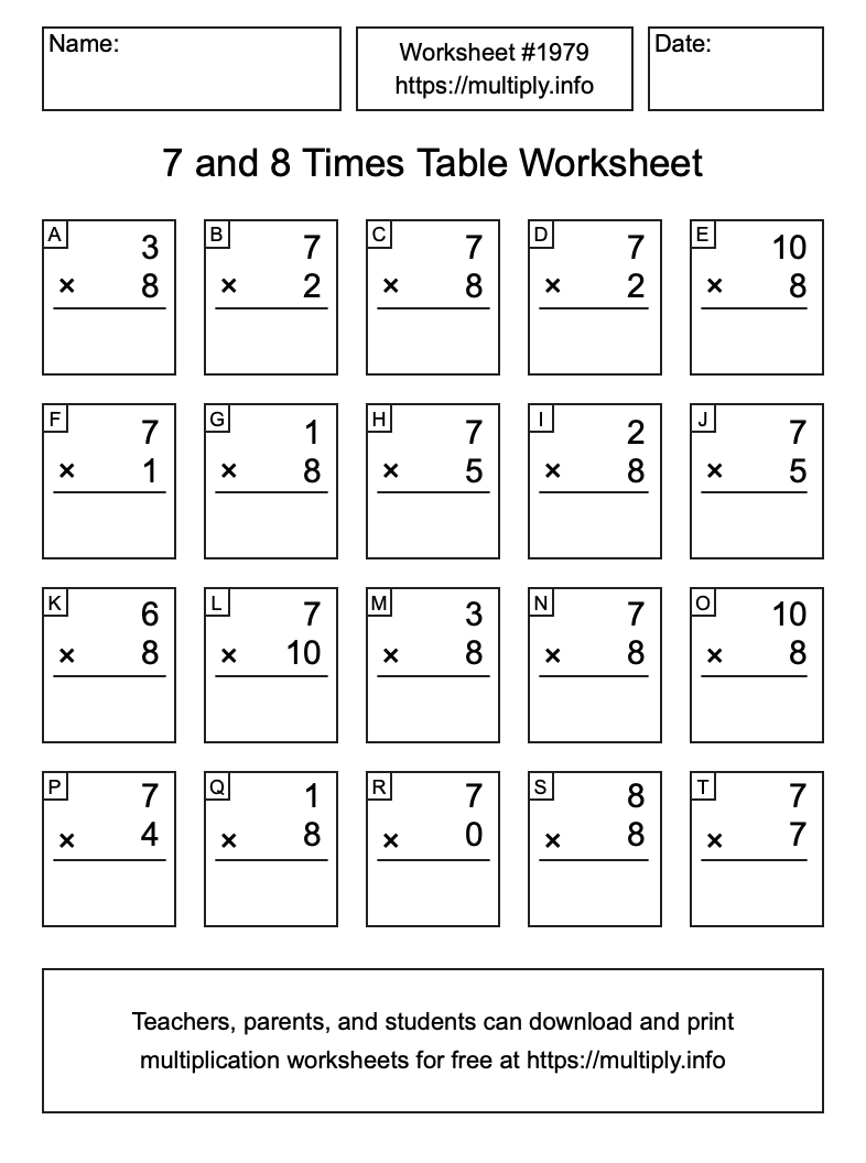 Here is the 7 and 8 Times Table Worksheet #1979. This worksheet contains problems related to the multiplication table of 7 and the multiplication table of 8. Print and/or save the worksheet using the buttons below the image. You can also drag or right-click on the image to download it to your device.