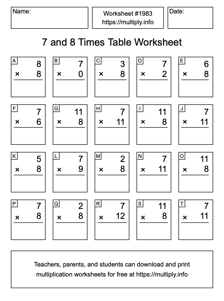 7 and 8 Times Table Worksheet #1984