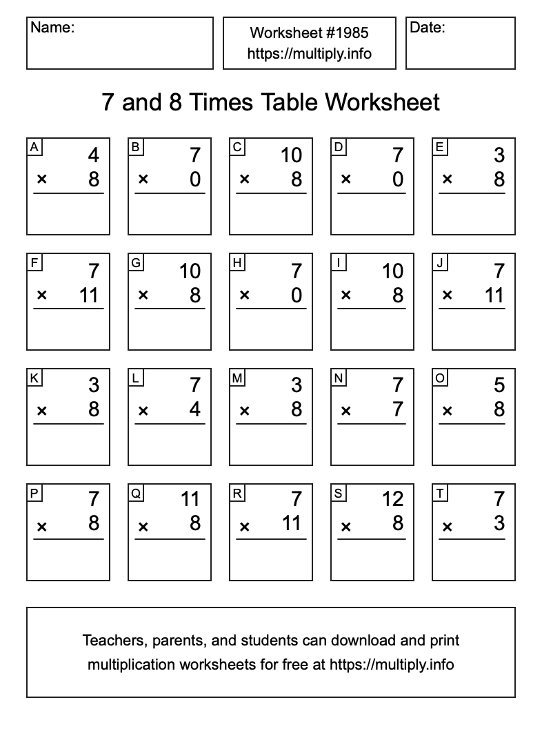 7 and 8 Times Table Worksheet #1986