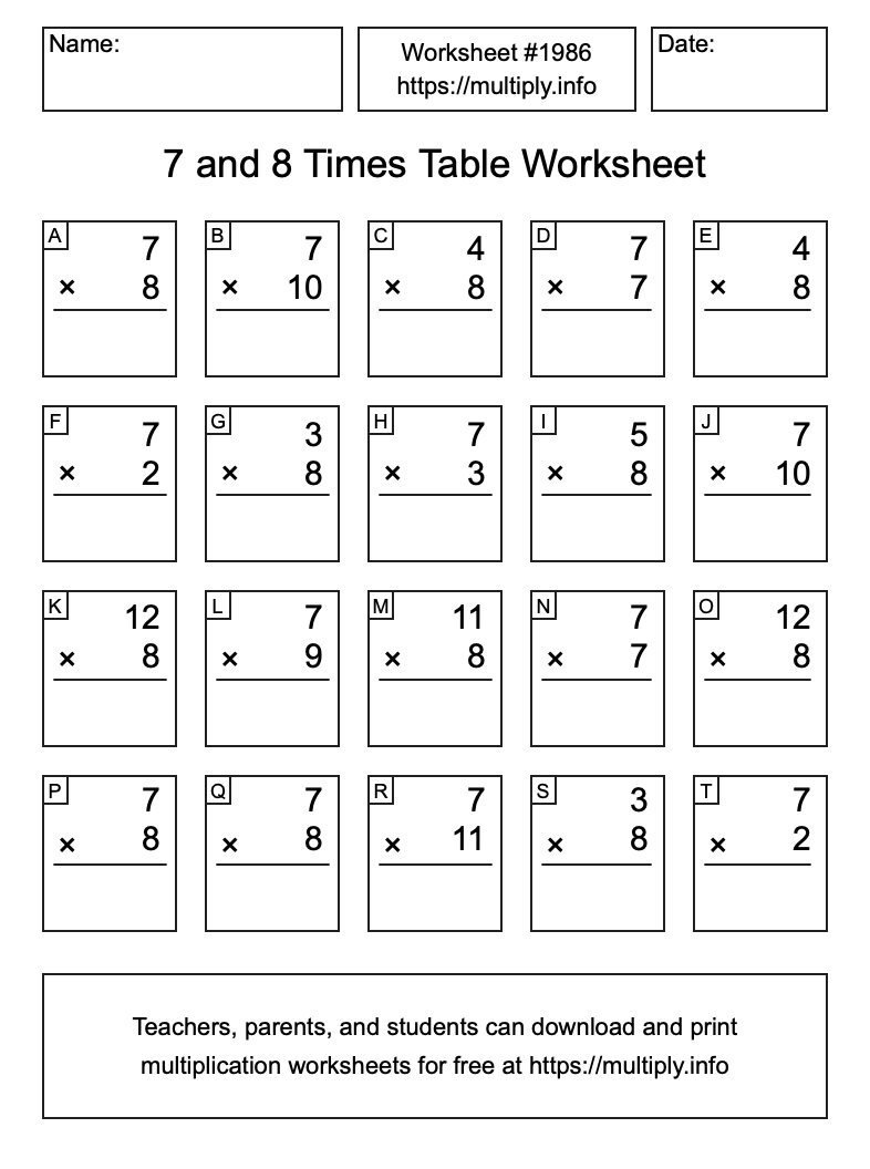 Here is the 7 and 8 Times Table Worksheet #1986. This worksheet contains problems related to the multiplication table of 7 and the multiplication table of 8. Print and/or save the worksheet using the buttons below the image. You can also drag or right-click on the image to download it to your device.