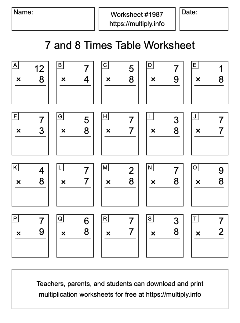 7 and 8 Times Table Worksheet #1988