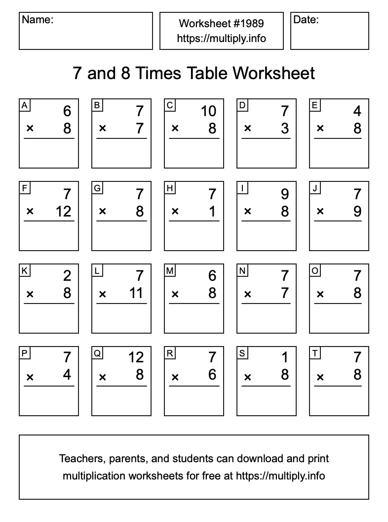 7 and 8 Times Table Worksheet #1990