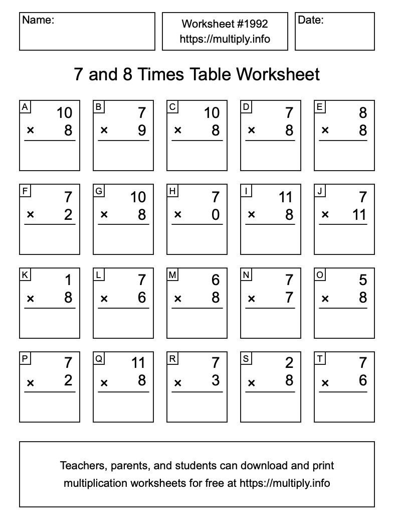 Here is the 7 and 8 Times Table Worksheet #1992. This worksheet contains problems related to the multiplication table of 7 and the multiplication table of 8. Print and/or save the worksheet using the buttons below the image. You can also drag or right-click on the image to download it to your device.