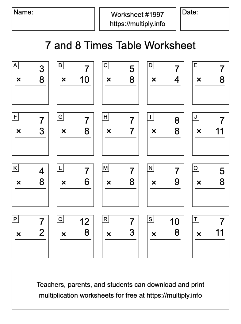 Here is the 7 and 8 Times Table Worksheet #1997. This worksheet contains problems related to the multiplication table of 7 and the multiplication table of 8. Print and/or save the worksheet using the buttons below the image. You can also drag or right-click on the image to download it to your device.