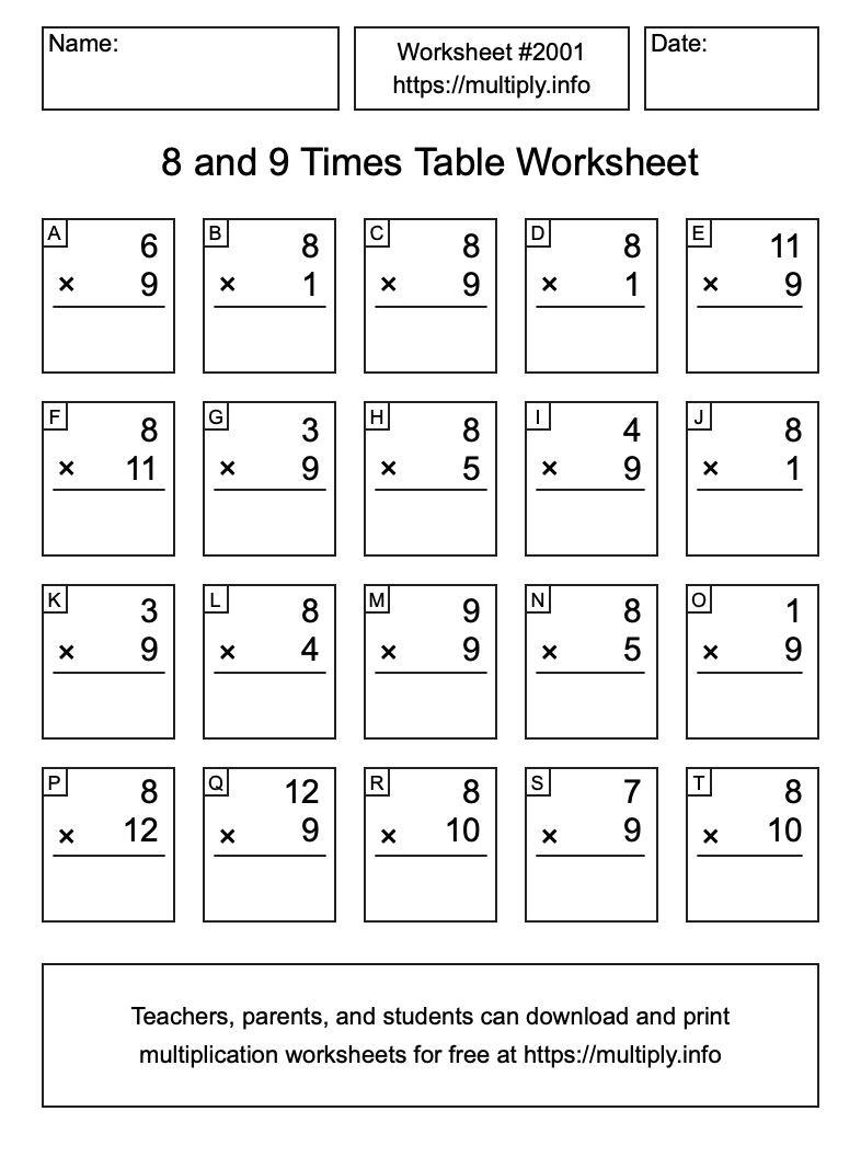 Here is the 8 and 9 Times Table Worksheet #2001. This worksheet contains problems related to the multiplication table of 8 and the multiplication table of 9. Print and/or save the worksheet using the buttons below the image. You can also drag or right-click on the image to download it to your device.