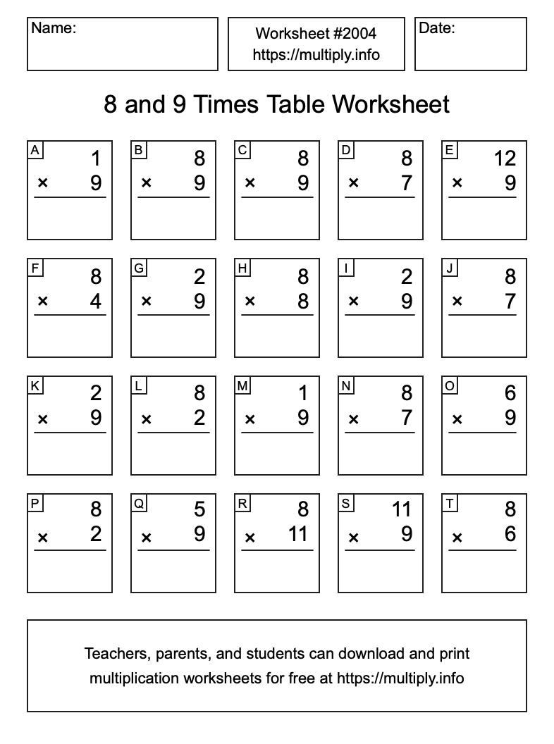Here is the 8 and 9 Times Table Worksheet #2004. This worksheet contains problems related to the multiplication table of 8 and the multiplication table of 9. Print and/or save the worksheet using the buttons below the image. You can also drag or right-click on the image to download it to your device.