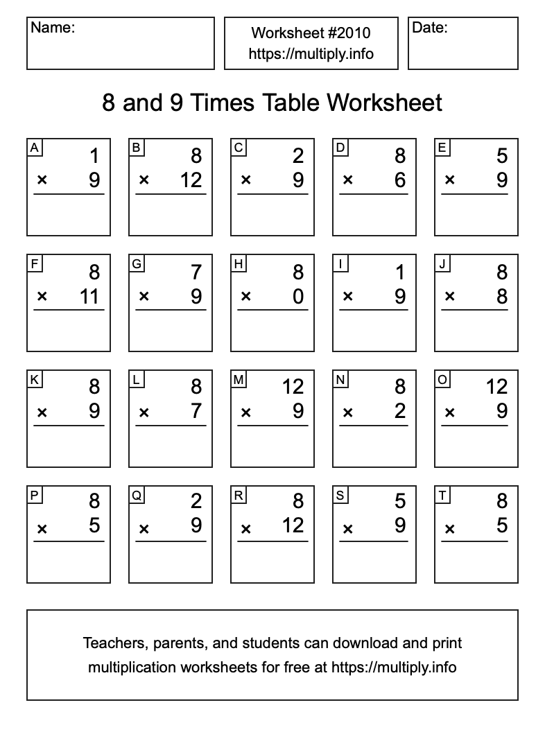 8 and 9 Times Table Worksheet #2011