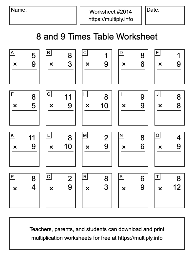 Here is the 8 and 9 Times Table Worksheet #2014. This worksheet contains problems related to the multiplication table of 8 and the multiplication table of 9. Print and/or save the worksheet using the buttons below the image. You can also drag or right-click on the image to download it to your device.