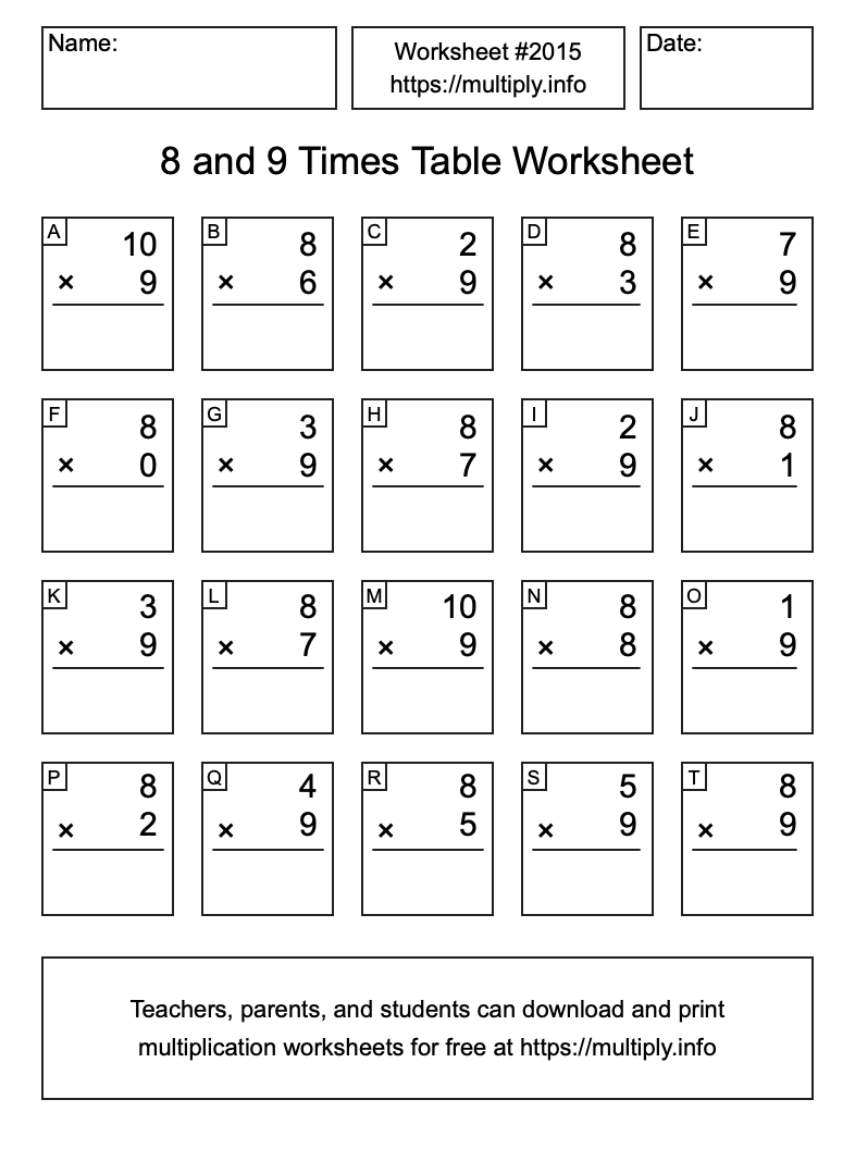 Here is the 8 and 9 Times Table Worksheet #2015. This worksheet contains problems related to the multiplication table of 8 and the multiplication table of 9. Print and/or save the worksheet using the buttons below the image. You can also drag or right-click on the image to download it to your device.