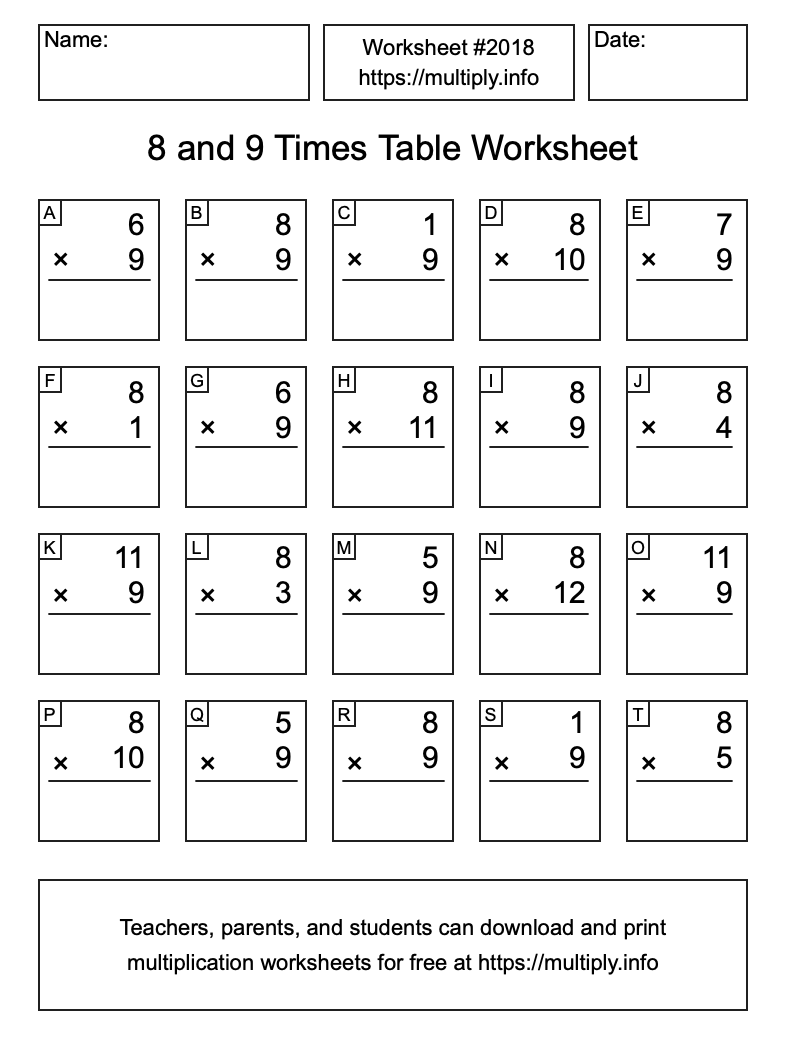 8 and 9 Times Table Worksheet #2019